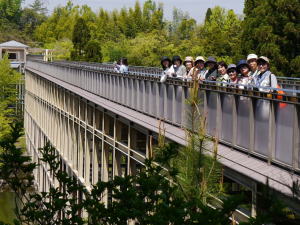 そして竹林の小径を経て亀山公園の展望台へ。保津峡が真下に見える絶景を堪能した後はおいしいお弁当タイム。京都駅で迷いに迷って買ったお弁当だけにみなさんのとても満足そうでした。