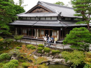 最初は吉城園。苔が生す小径を経て、茶室へ。茶室のたたきから見る茶花の庭はなかなかの風情です。母屋の手作りガラスに映る景色もまたいいものでした。