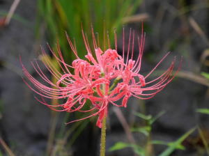 「晴れ女」が参加されたにもかかわらず珍しく朝から時々の雨模様!。さらに彼岸花も残念ながらほぼ終わり。それでもところどころに私たちを待っててくれた彼岸花を見つけてはレンズに収めていました。