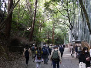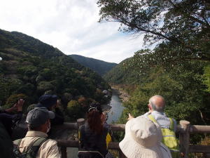 最初はお酒の神様といわれる松尾大社で参拝の後、桂川沿いの遊歩道を北上。愛宕山や小倉山に加えて、河川敷のグランドでは少年野球、桂川では鮎とりの投網など秋晴れののどかな風景が楽しいさるくを演出してくれます。 渡月橋の眺望に加えて、おいしいお弁当と久し振りのおしゃべりでまさに至福のひと時を過ごした後、渡月橋を渡り、保津峡やトロッコ列車を見下ろせる絶景の展望台を経て、超人気の竹林の小径を巡り無事終了。
